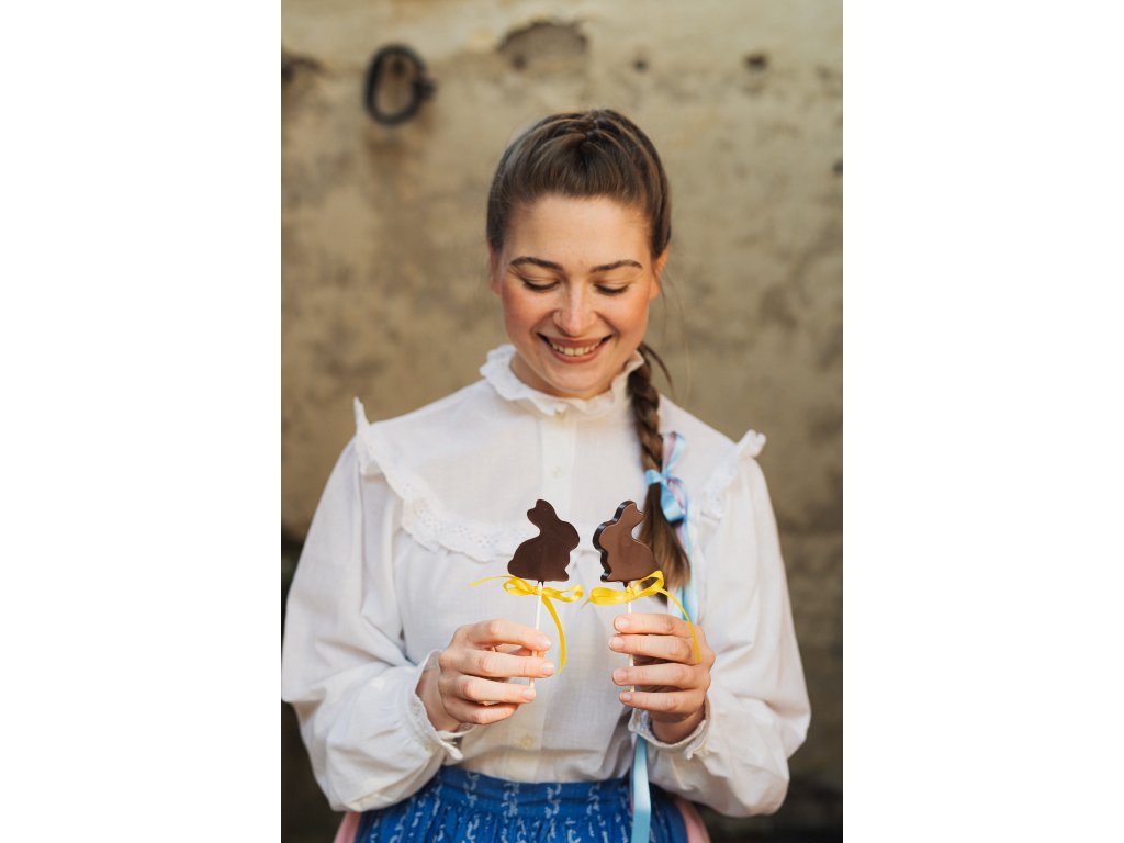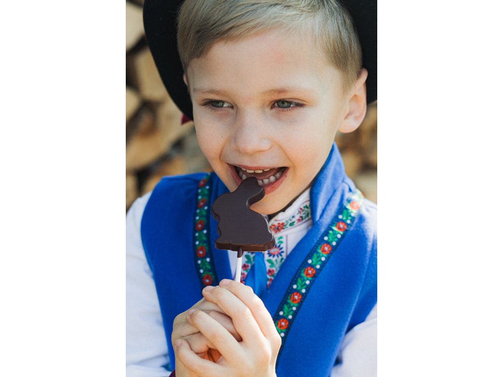Tenhle zajíček vám z velikonoční hostiny jen tak neuteče. Ať už hledáte drobnost do výslužky nebo sladkost pro malé mlsouny, lízátko ve tvaru zajíčka je sázka na jistotu. Připravili jsme ho ve dvou variantách, aby si vybral opravdu každý. Pokud máte rádi výraznou kakaovou chuť, potěší vás zajíček ze 70% tmavé čokolády. A pro ty, kteří dávají přednost jemnější a krémovější chuti, tu máme variantu z naší 57% mléčné čokolády.