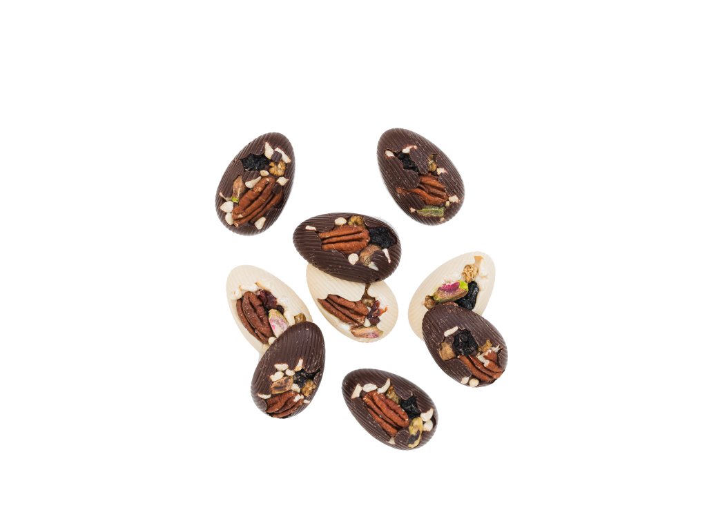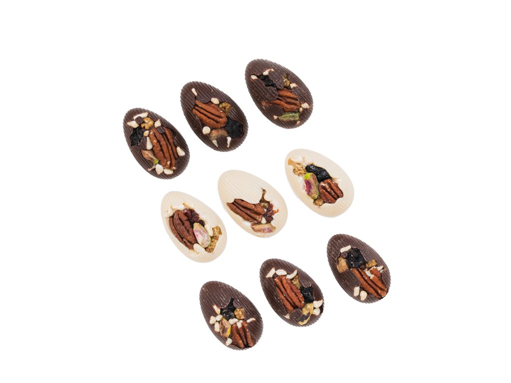 Velikonoční vajca 9 půl-vajíček z tmavé, mléčné a bílé čokolády s variací oříšků a sušeného ovoce